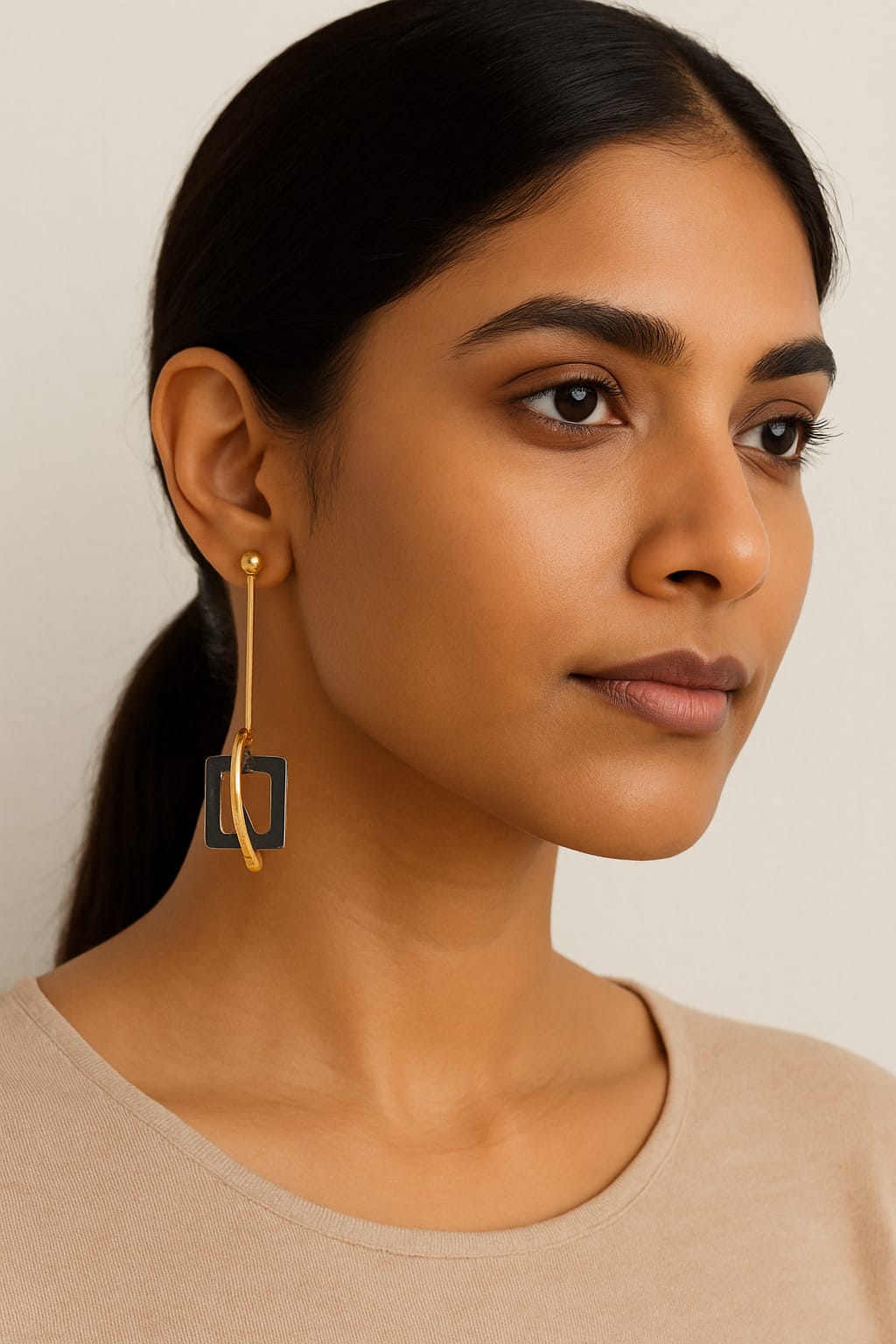 Crafted from premium artificial alloy, these earrings feature a gold-tone polished finish combined with sleek matte black geometric accents. Designed by GlowingFusions, they are lightweight, durable, and made to bring a premium look without the cost of precious metals.