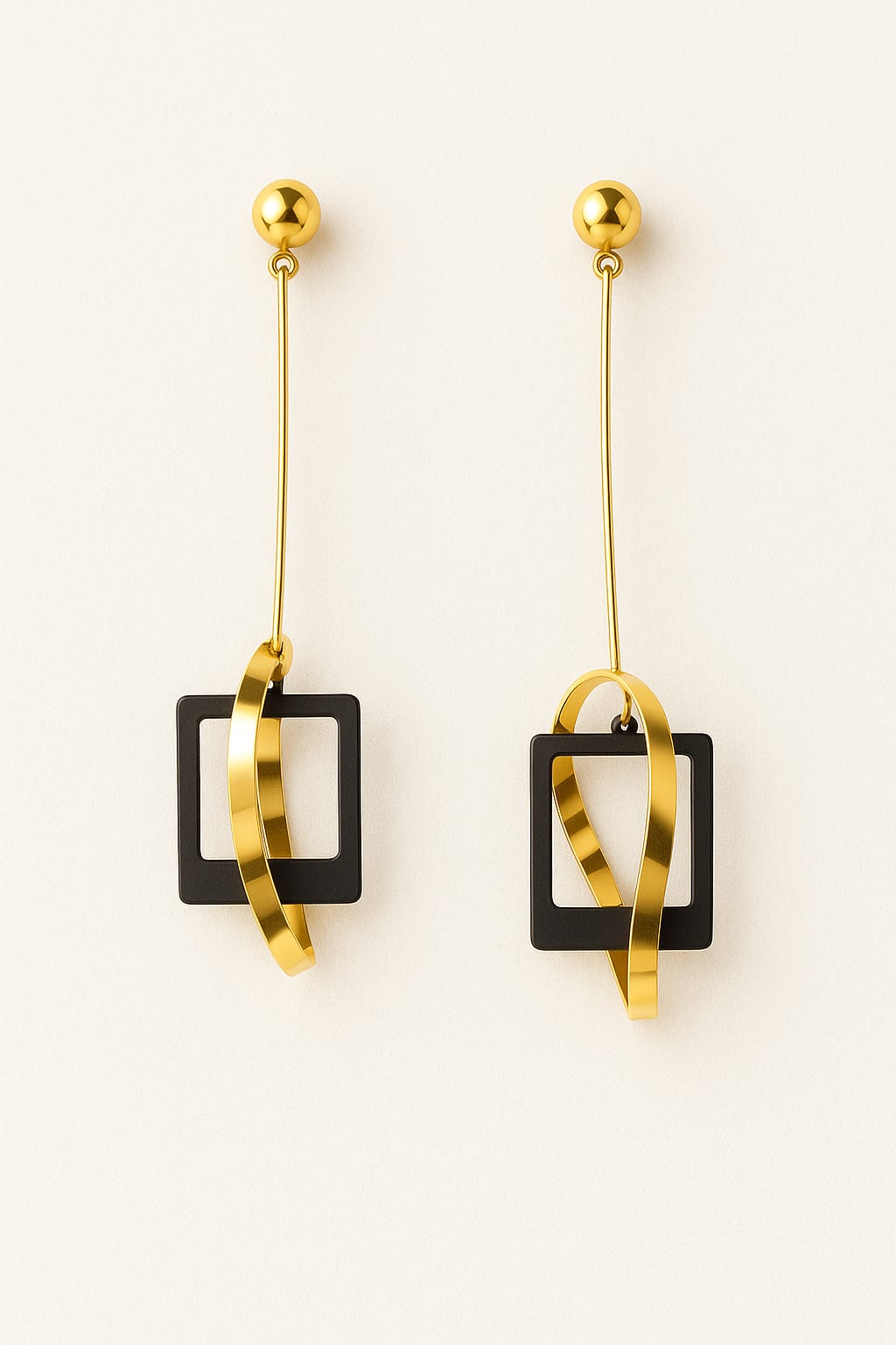 With a high-shine gold-tone twist and a matte black rectangular base, these earrings strike the perfect balance between elegance and edge. The polished metallic finish adds brilliance, while the black frame brings depth and contrast.