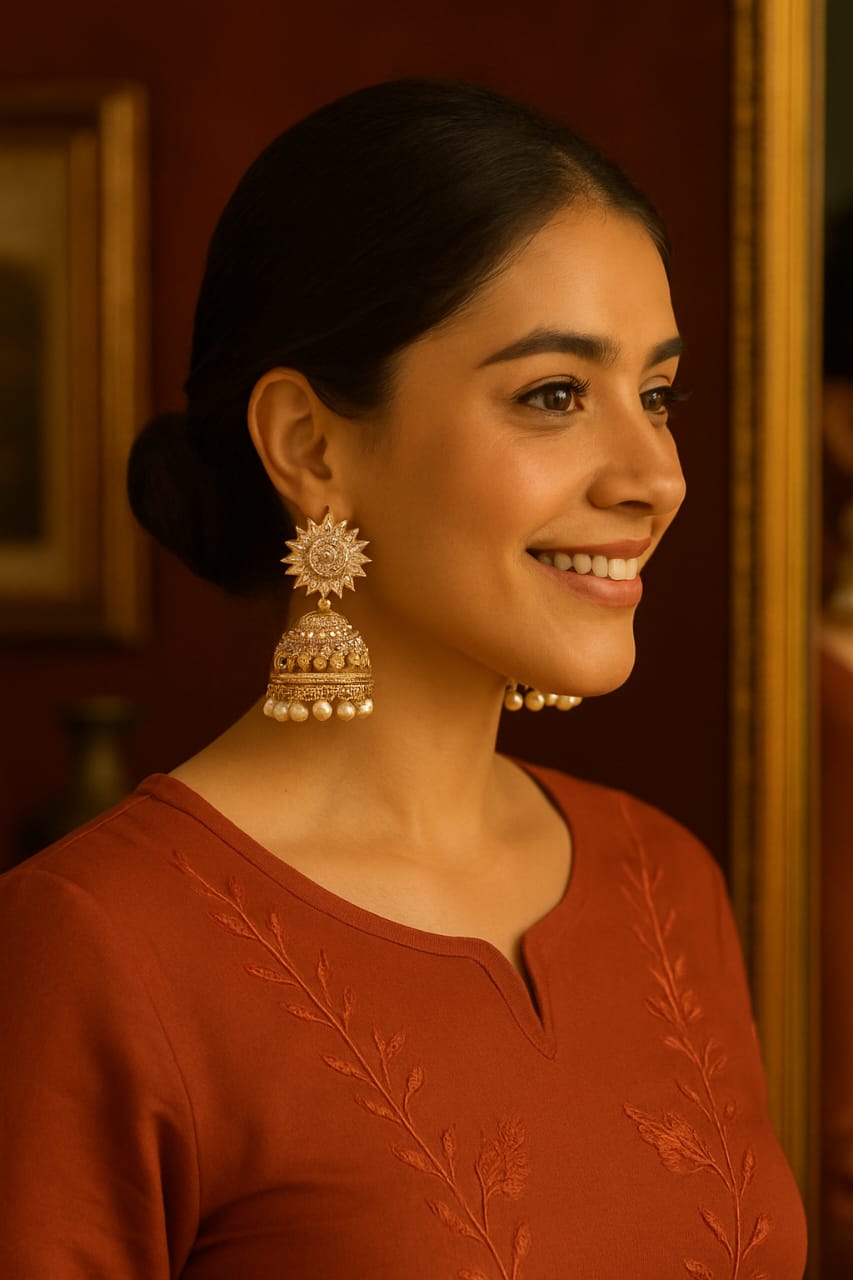 Elevate your style with our Star Elegance Pearl Jhumkas, a timeless blend of tradition and glamour. The earrings feature a captivating starburst top studded with sparkling white stones, leading into intricately crafted gold-plated jhumka domes encrusted with delicate crystals. Each dome is finished with a row of lustrous pearl drops that sway gracefully with every movement. Perfect for festive occasions, weddings, or an elegant evening with friends, these jhumkas are designed to draw attention while complementing a wide range of outfits. Lightweight yet luxurious, they ensure comfort along with unmatched sophistication.